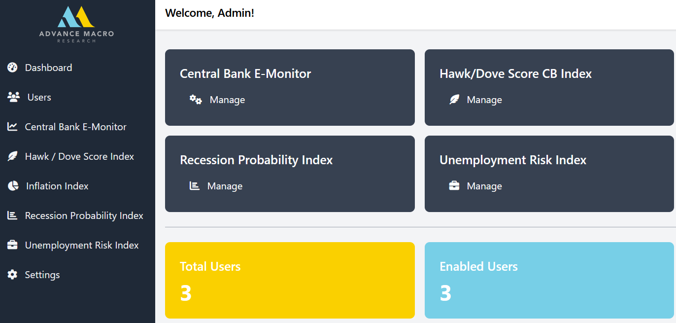 This project provide cohesive macro analytics, helping users navigate the complex macroeconomic landscape. Analysis from advanced statistical techniques are used to identify and interpret key trends from the multitude of available data. Analytics provide Global Banks Monitor, Recession, Hawk/Dove Index, Inflation Index, Unemployment Index, among many others.